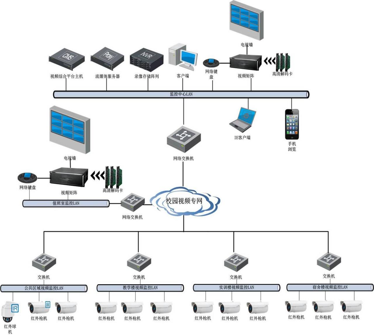(3)前端設(shè)備負(fù)責(zé)時(shí)時(shí)采集校園內(nèi)的情況,將拍攝到的視頻或圖像傳送回分控中心和主控中心。視頻監(jiān)控系統(tǒng)前端選用高清網(wǎng)絡(luò)攝像機(jī),實(shí)現(xiàn)對(duì)學(xué)校各個(gè)重要點(diǎn)位,包括教學(xué)樓、一體化樓、實(shí)訓(xùn)樓、辦公樓、學(xué)生宿舍、學(xué)生食堂、校內(nèi)重要場(chǎng)所的安全監(jiān)控。